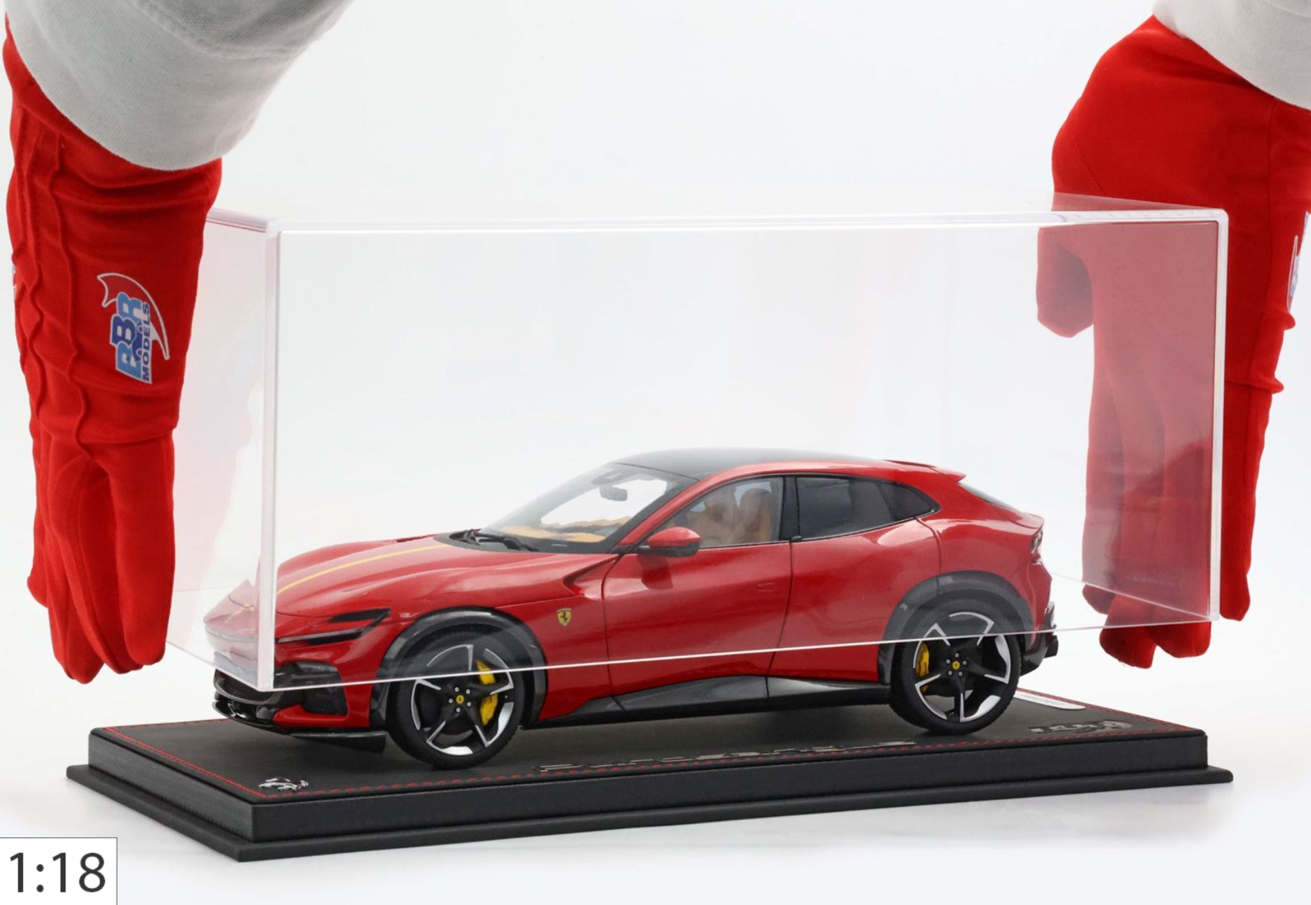 Only 20 pieces made. Discover the finest 1:18 models from BBR. Comes with its original display case to protect this rare work of art and a Luxury Pack. Scale model of the Ferrari Purosangue finished in Rosso Corsa with the optional Yellow Stripe. This 1:18 scale model can be fully opened to reveal the incredible work made by BBR Models. Details on this model are extremely realistic.