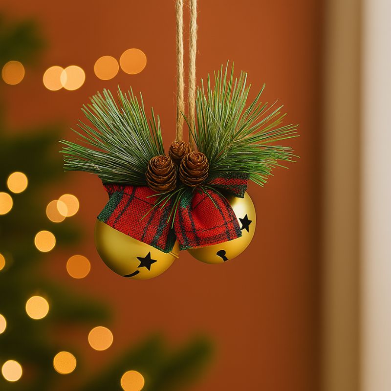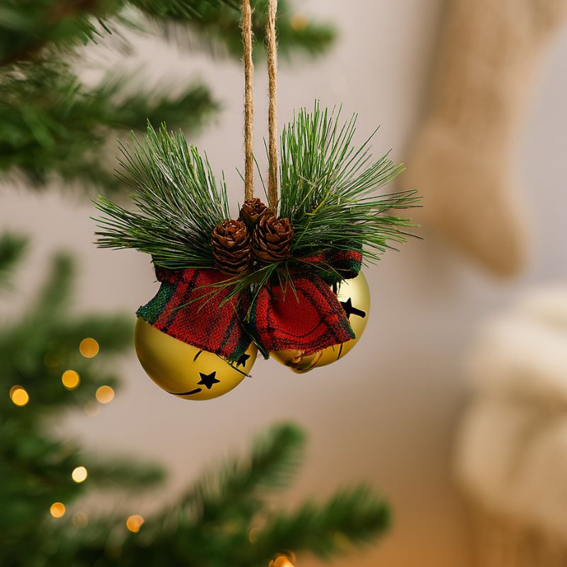 Un set di due splendidi campanellini oro, con pigne, rametti e fiocchetto scozzese! Le campanelline hanno un diametro di circa 4cm e suonano! Perfette per essere appese sul tuo albero oppure come segnaposto, o ancora come decorazione in qualsiasi ambiente!