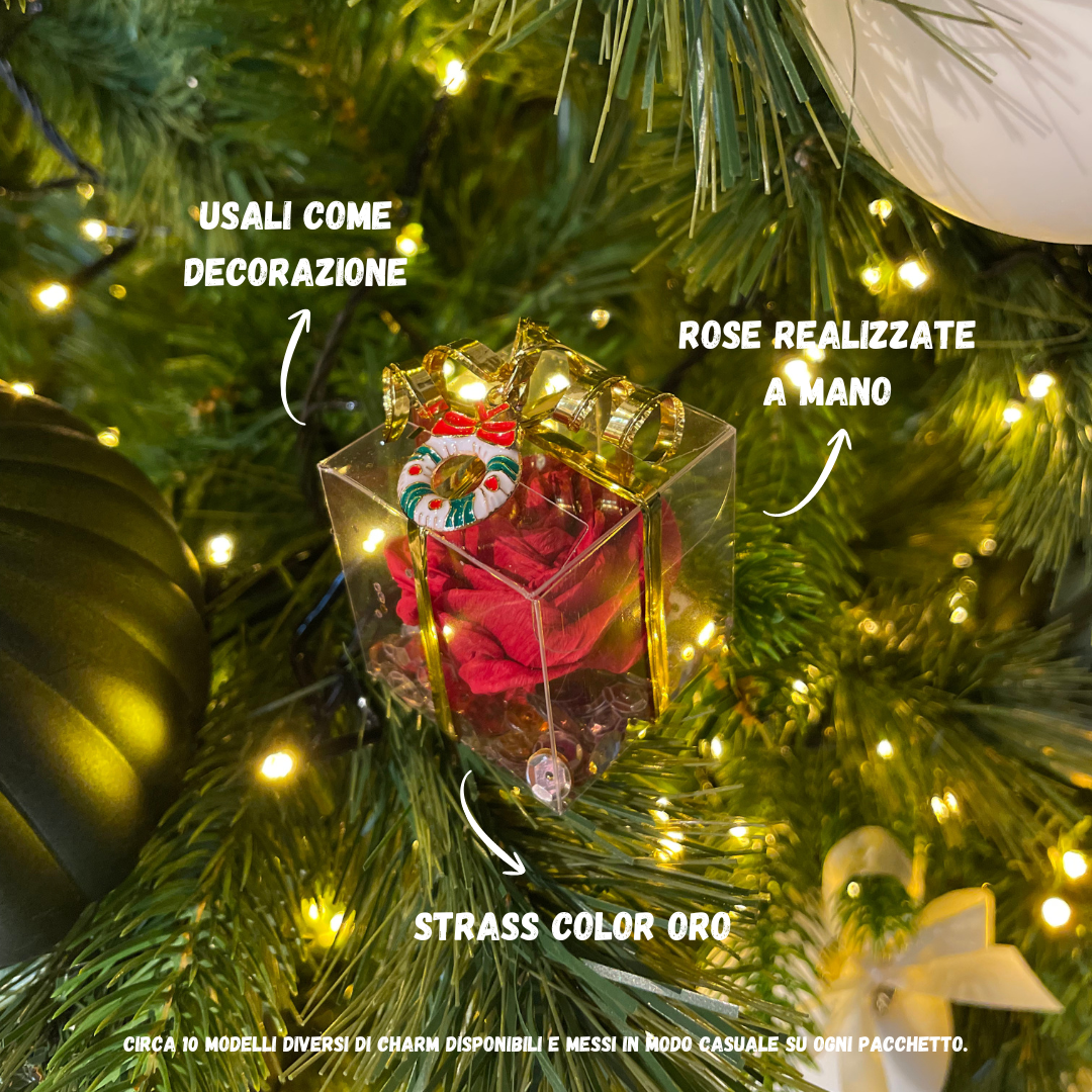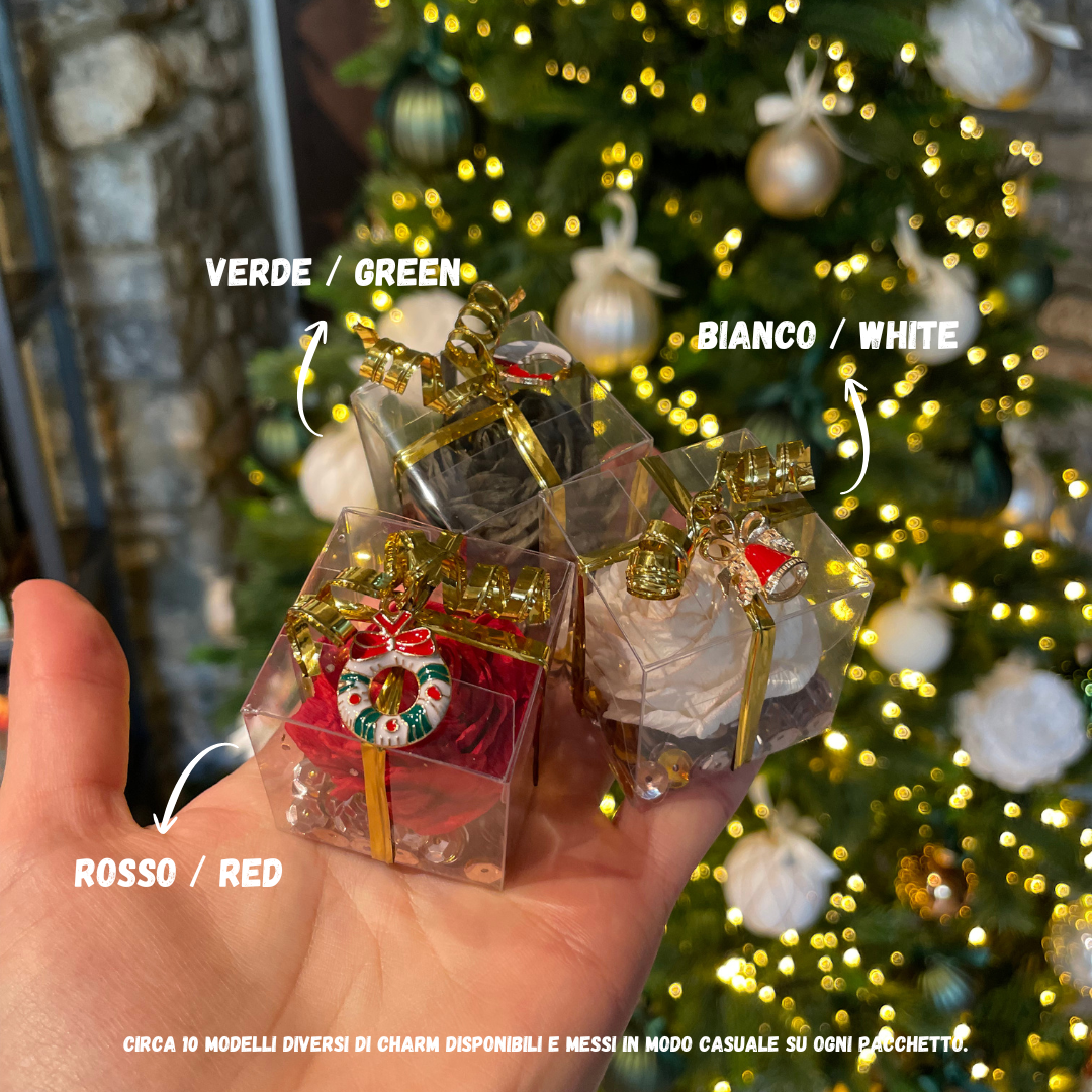Mini pacchetto natalizio con rosa realizzata a mano e strass oro (dim. 4x4x4cm), realizzati da Star Model Toys! Usali come piccoli segnaposto o come ornamenti e decorazioni natalizie. Rendi il tuo Natale ancora più unico con questa piccola idea regalo! Ogni pacchetto è impreziosito da un charm a tema, ogni charm è unico e differente!