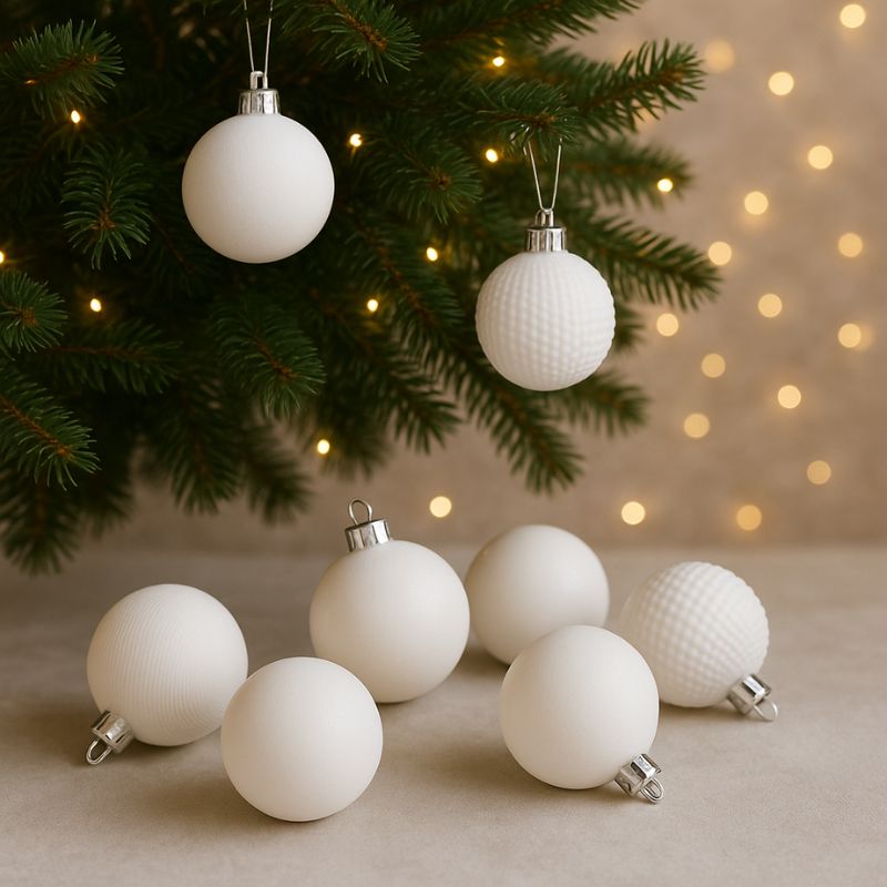 Un set di 18 palline bianche con finiture eleganti, rifinito in un box piramidale. Le palline sono di 3 dimensioni (5cm , 6cm, 7cm) ed hanno texture diverse, realizzate in PVC infrangibile. Ideali per decorare l'albero di Natale e per dare un tocco unico al tuo ambiente!