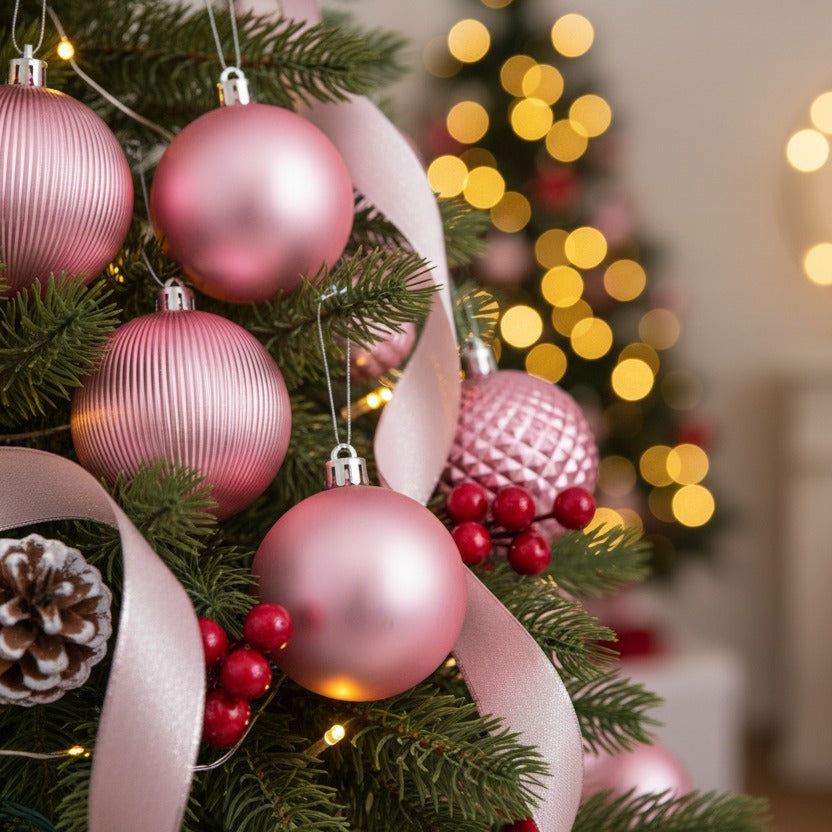 Un set di 18 palline rosa con finiture eleganti, rifinito in un box piramidale. Le palline sono di 3 dimensioni (5cm , 6cm, 7cm) ed hanno texture diverse, realizzate in PVC infrangibile. Ideali per decorare l'albero di Natale e per dare un tocco unico al tuo ambiente!